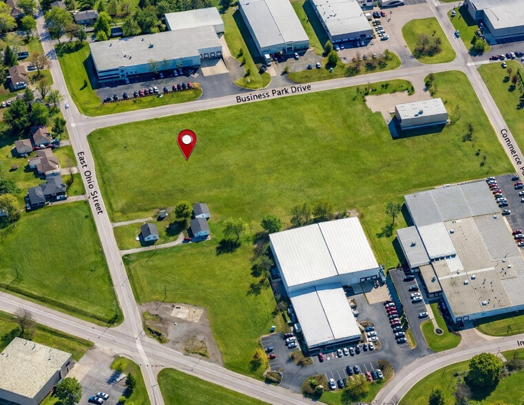 The site benefits from direct frontage along E. Ohio Street with immediate access to Business Park Drive and Commerce Parkway, providing efficient circulation for both passenger vehicles and commercial traffic. Surrounding uses include light industrial buildings, warehouse facilities, and flex space, reinforcing the property's suitability for similar development.