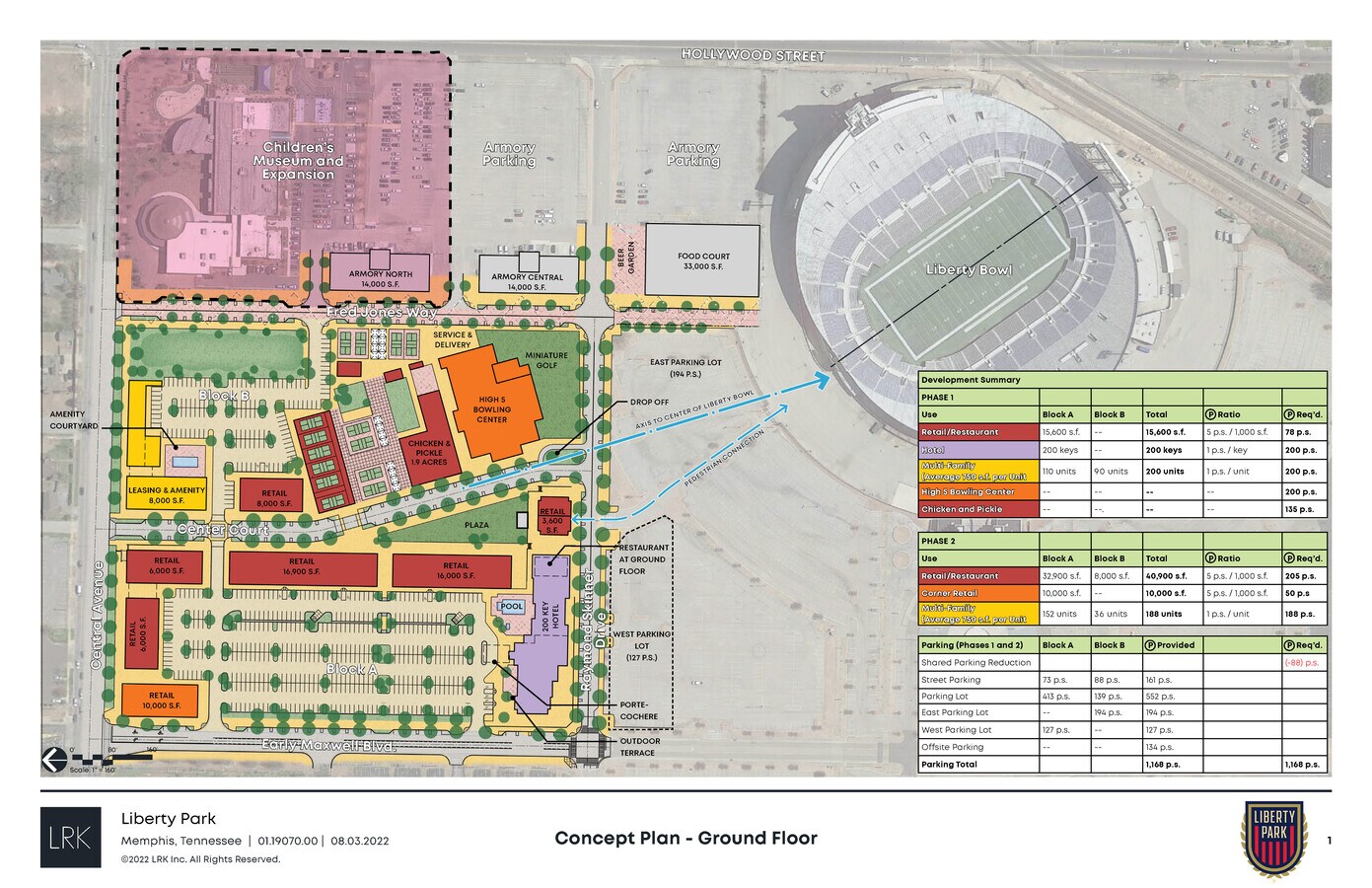 Liberty Park is located within Midtown Memphis, in the heart of the City and characterized by a uniquely dense mix of residential and commercial uses. There is new energy in Midtown, an area always seen as one of Memphis’ most valued. Residential growth within the immediate area is increasing and commercial investment is on the rise. The City of Memphis is focusing that momentum and creativity to further increase the vibrancy of Liberty Park by creating a mixed-use, sports tourism destination campus that is truly “Central to Everything”. Phased openings beginning in 2022. Proposed mixed-use walkable community with 100,000 SF of retail and dining, 90,000 SF of family entertainment venues, 90,000 SF of office space, two hotels and up to 150 apartment units located in the heart of Midtown Memphis Ideal for restaurants, entertainment, specialty retail services and office use 65,000± SF of retail space available for lease in Phase I of this new development Traffic Counts: Central Avenue 21,811 AADT and East Parkway 36,251 AADT