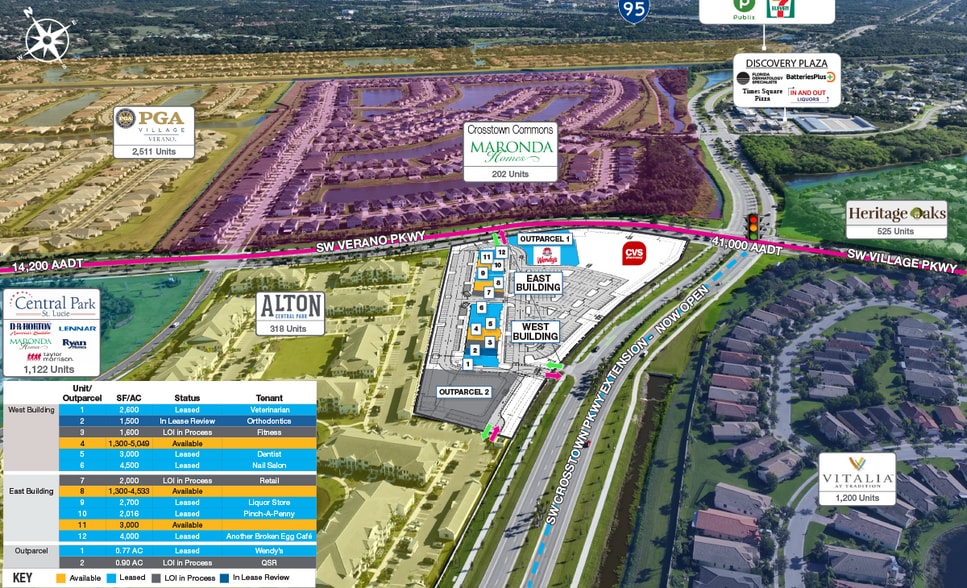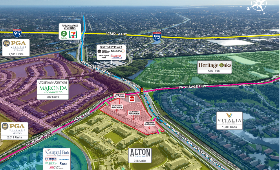 Prime commercial leasing opportunity in Tradition, the fastest growing town on the Treasure Coast. The property has been conceptually laid out for inline space with two outparcels. The site is in an ideal location with the recent completion of the Crosstown Parkway extension now connecting to Rangeline Road to the West. The site is located nearby Publix and residential developments from homebuilders, including DR Horton, Ryan Homes, Mattamy Homes, Kolter, Taylor Morrison, GHO Homes, and more. The property is situated at the signalized intersection of Crosstown Parkway and Verano Parkway. This site enjoys the benefits of its location on a main east/west thoroughfare with an interchange with I-95, just 1 mile east. Moreover, there is a limited amount of commercial (existing and proposed) in the vicinity of this property, providing insulation from competitors on this crucial entrance to Tradition and Verano. • Address: Crosstown Pkwy & Verano Pkwy • Parcel IDs: 3332-700-0032-000-1, 3332-700-0030-000-7 • Pricing: $48/SF NNN (End Caps) / $42/SF NNN(Inline), Outparcels: $95K NNN (Ground Lease), $45/SF (Land Purchase) • Available Size: 1,300 - 5,064 SF • Frontage: ±350’ on SW Village Parkway, ±700’ on Crosstown Parkway • Estimated Delivery: June 2026 • Access: Signalized / Lighted • AADT: 41,000 and growing with major communities under construction