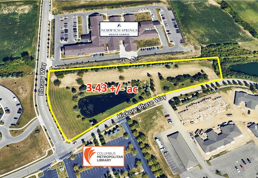 3.43 +/- acres at the northeast corner of Library Way and Hickory Chase Way. Zoned I-270 Corridor (I) District/I - 3 Suburban allows for multi-unit supportive housing residence or accessory uses such as medical/general office, office flex, short-term rental, bed and breakfast and possibly townhomes. Nestled in between the Columbus Metropolitan Library and independent living apartments.