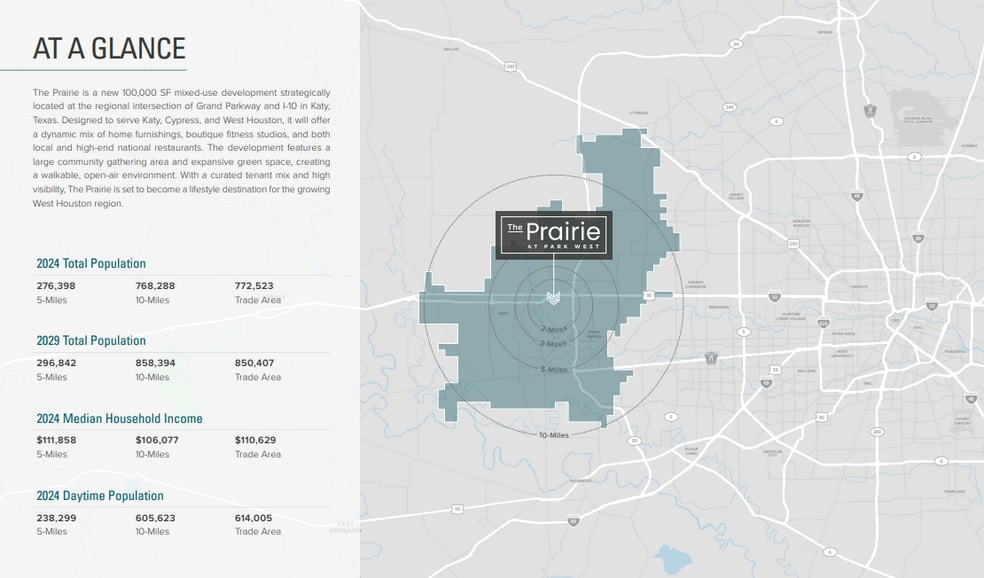 The Prairie is a new 100,000 SF mixed-use development strategically located at the regional intersection of Grand Parkway and I-10 in Katy, Texas. Designed to serve Katy, Cypress, and West Houston, it will offer a dynamic mix of home furnishings, boutique fitness studios, and both local and high-end national restaurants. The development features a large community gathering area and expansive green space, creating a walkable, open-air environment. With a curated tenant mix and high visibility, The Prairie is set to become a lifestyle destination for the growing West Houston region.