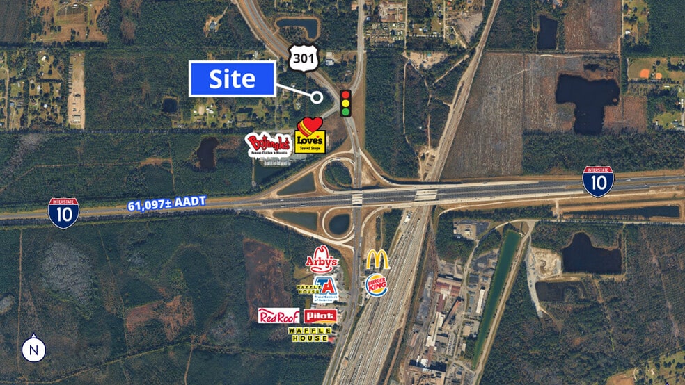 - Signalized corner adjacent to Love's Truck Stop - Recently rezoned to PUD, allowing for most CCG-1 uses - Buyer will need to bring utilities to the site - Interstate play positioned for QSR drive-thru, gas, restaurant other commercial uses - Traffic counts: US-301/Baldwin Bypass: 7,800 AADT and I-10: 61,097 AADT