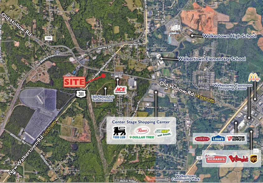 Walkertown’s strategic location near Winston-Salem provides access to a thriving regional economy and a growing population. The surrounding community features established shopping centers, schools, and recreational amenities, making this site ideal for quick-service restaurants, convenience retail, or neighborhood services. With Brunswick County ranking among the fastest-growing regions in North Carolina, this property represents a rare chance to secure a well-positioned asset in a high-demand corridor. The property benefits from strong traffic counts—14,000 CPD on Old Hollow Road and 5,200 CPD on New Walkertown Road—ensuring excellent visibility and accessibility. A new 160-unit residential subdivision is under construction directly behind the site, adding to the area’s robust consumer base and creating synergy for future retail development.