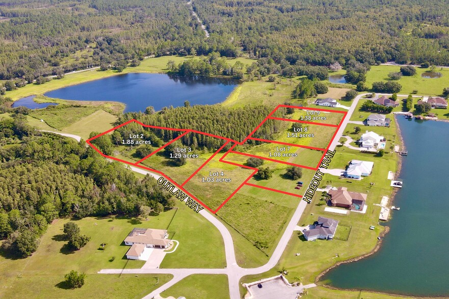 The lots are located within Outlaw Ridge, a gated community, on Outlaw Way and Hideout Trail in Land O' Lakes in Pasco County. Outlaw Ridge is situated on Ehren Cutoff. Ehren Cutoff connects US 41 to State Road 52.