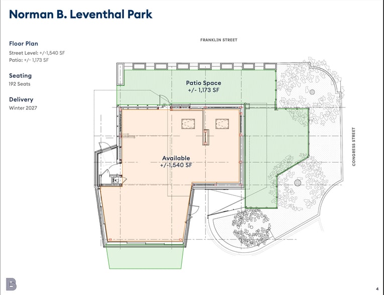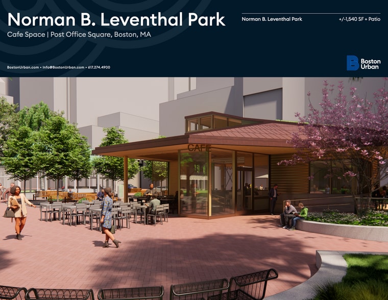 +/-1,540 SF of café space along with a +/- 1,173 SF patio is available at Norman B. Leventhal Park, a newly designed and constructed single-tenant building in the heart of Post Office Square. The single story building has been designed by Touloukian Touloukian Inc. The project is expected to be completed Spring 2027. In the heart of the financial district, nestled among the high-rise office buildings, lies a lush oasis of green, a testament to the ingenuity and creativity of a group of people, both public and private, who joined together to foster this unique vision. What had previously been a decrepit and unsightly garage, is now an award-winning and inviting park set above an underground parking garage. The Norman B. Leventhal Park is supported, structurally and financially, by Garage at Post Office Square, a 1,400-space parking garage. “The 1.7 acre park’s centerpiece is a walk-through sculptural fountain, so whimsically friendly that in the summertime, office workers eating lunch often kick off their shoes to dip their feet in the fountain. A few yards away is a 143-foot-long formal garden trellis, supported by granite columns, draped with seven species of vines. The jewel-like Great Lawn, raised above the walkways by a granite curb, provides a relaxed retreat. More than a hundred different species of plants, flowers, bushes and trees are within the park. It features custom wrought-iron fencing and specially designed drainage gates. Seating styles fit every posterior and mood – stately teak benches, curving steel settees, movable cast-iron café chairs with tables, hundred of linear feet of inviting polished granite wall and half an acre of lawn, all meticulously maintained” (Urban Parks and Open Space, Urban Land Institute, 1997).