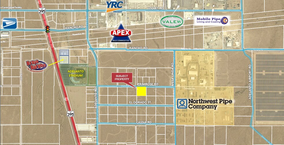 ±2.21 acres of unimproved industrial land for sale on Cassia Rd in Adelanto; 3128-261-05. Zoned Light Manufacturing (LM) and approved for a variety of industrial purposes, including warehousing, assembly/manufacturing, contractor yards, and cannabis cultivation and processing. Water, sewer, and power are available at site. Neighboring businesses include XPO Logistics, Northwest Pipe Supply, Adelanto Event Center, Diversified Minerals, and Nova Storage. This location is in proximity to support the Southern California Logistics Airport, whose tenant roster includes Amazon, Boeing, GE Aviation, Kuerig Dr. Pepper, M&M/Mars, Newell Rubbermaid, and more. Immediate access to Highway 395, 8 miles to Interstate 15, and 70 miles to the Ports of Los Angeles. This site is also 25 miles from BNSF’s future Barstow International Gateway (BIG), a state-of-the-art intermodal facility spanning 4,500-acres designed to revolutionize international logistics and distribution regionally and domestically. Buyer to verify all information contained herein. Agent and their representatives are not responsible for the accuracy of these claims.