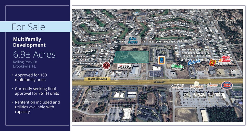 Approved for 100 Multifamily units (Currently seeking final approval for 76 TH units) • Extremely well located in the heart of Brooksville • Great visibility and access • Retention included and utilities available with capacity • The property is part of the Vista Park mixed-use development with ALDI, Vista Park Assisted Living, and O’Reilly’s Auto. • The immediate area is considered a very established suburban market and is comprised of many single-family communities, restaurants and retail shopping centers. Within a mile or less of the site are the following destination: Starbucks, Sam’s, Walmart, Aldi, Dick’s Sporting Goods, Cheddars Scratch Kitchen, Ross Dress for Less, Marshalls, Chick-fil-A, WaWa, plus many more.
