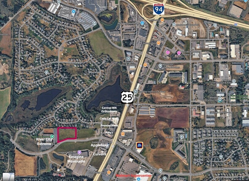 This 2.57-acre commercial land opportunity in Monticello delivers exceptional visibility and strategic positioning within one of the region’s most dynamic growth corridors. Located directly off School Blvd with immediate access to Interstate 94 and just west of Highway 25, the property sits within Monticello’s thriving commercial node, benefiting from steady traffic, established co-tenancy, and strong local demographics. The site’s proximity to notable national and regional operators including River City Extreme, Taco John’s, Culver’s, Premier Bank, Buffalo Wild Wings, Walmart Supercenter, Applebee’s, Emagine Monticello, Aldi’s, Aspen Dental, KwikTrip, and Sherwin Williams positions it squarely within a proven, high-demand trade area.