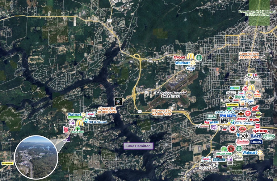 Strategically positioned near major demand drivers, including Lake Hamilton (±1.5 miles), Oaklawn Racing Casino Resort (±7 miles), and Bathhouse Row (±7.5 miles).