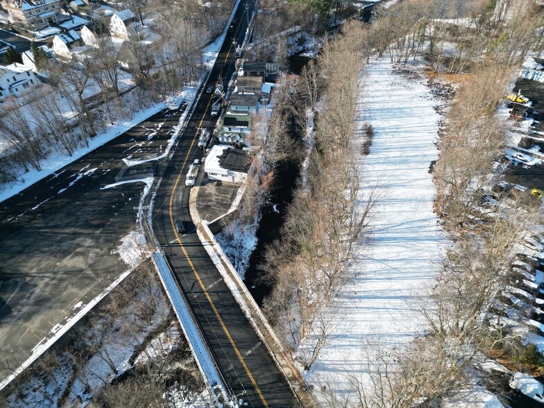 Level, cleared, paved, lightly treed perimeter, abuts the Naugatuck River to the west.