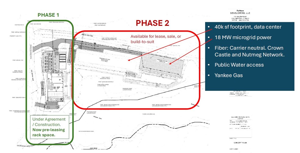 • Colchester, CT, rural suburb of Hartford, located ½ way between NYC and Boston • 10 MW approval by CT Siting Council (and all other authorities) to generate power on site (Expandable to 18MW) • Natural Gas-fired Bloom Fuel Cells • Data center pad is a 40k sf footprint. Buildable to two floors for a total of 80k sf. • Rooftop solar • Fuel Cells ready to convert to RNG or H2 when distribution network is available • Options for battery storage, belly tank generator, or carbon capture • Waste Heat and stormwater capture • Will send excess power, heat, and water to an organic greenhouse on site • A portion of the produce will be donated to local foodbanks, schools, and other charities • Seeking a data center owner to lease the ground for $1 and sign a PPA for predictable cost power from our 10 MW power pad, build your own data center • Our power will cost less than grid power • The grid will not have capacity for several years, but could convert to grid power in the future