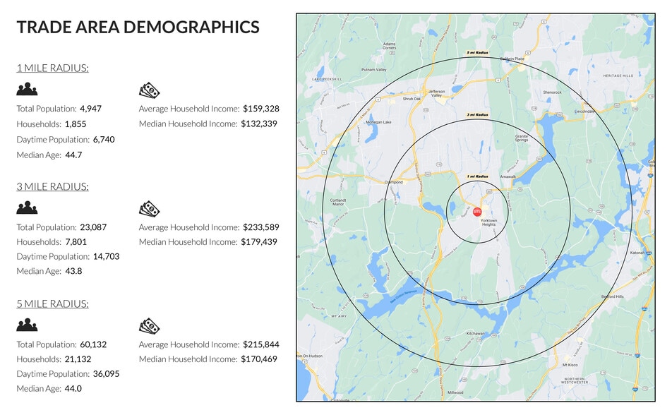 1.68 Acres, approximately 50% developable. Site had previously been approved for a 3,848 SF Bank with a Drive Thru. Inclusive C-3 Zoning allows a wide range of commercial uses, including food & medical. Shared intersection with the main entrance to the Yorktown Green Shopping Center, anchored by a newly opened, approximately 50,000 SF Uncle Giuseppe’s Marketplace. Retail hub serving a large, affluent demographic, with easy access from the Taconic State Parkway. Available for Ground Lease or Build to Suit, with the ability to have a Drive Thru.