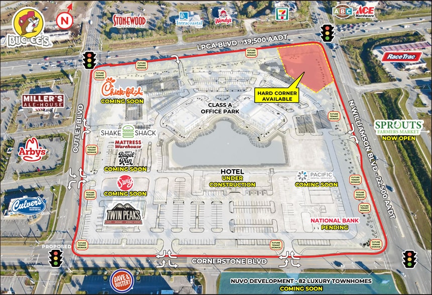 Located at the hard corner of LPGA Boulevard and Outlet Boulevard, this premier retail outparcel at Cornerstone Exchange offers unmatched visibility and access in one of Daytona Beach’s fastest-growing commercial corridors. Positioned just off Interstate 95, the site sits at the gateway to Tomoka Town Center and Tanger Outlets, drawing consistent traffic from both local residents and the region’s 8 million annual visitors. The surrounding area is a magnet for national retailers, quick-service restaurants, and lifestyle brands, with co-tenancy including Sprouts (NOW OPEN), Trader Joe’s, Culver’s, Chipotle, Chick-fil-A, Shake Shack, and Miller’s Ale House. The property is also adjacent to major residential developments such as Madison Pointe, Tomoka Point, and the Oasis mixed-use project, which together contribute thousands of new housing units and a growing consumer base. With traffic counts exceeding 85,500 AADT across LPGA and Williamson Boulevards, and projected population growth of 12% annually within one mile, this site is ideal for QSRs, drive-thru concepts, and retail brands seeking high-exposure frontage in a thriving retail hub. The property is also less than one mile from Latitude Margaritaville, a 55+ community with over 7,500 units under construction, further enhancing daytime and weekend traffic.