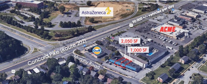 Highly-visible retail units at Murphy Road Plaza, a well-established retail center at the corner of Murphy Road and Route 202. Spaces ben be leased separately or combined for a total of 3,050 SF. Traffic counts: 18,000 VPD (Murphy Road) and 53,000 VPD (Concord Pike). Near I-95 North/South. Average household median income: $163,000