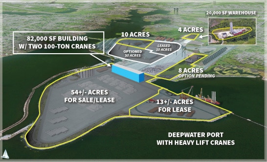Heavy industrial waterfront site offering 90 acres of development-ready land with deep water port access and heavy lift crane capabilities. This property features a 82,000 SF manufacturing building equipped with two 100-ton cranes and 100' ceilings, plus a 20,000 SF warehouse on 4 acres. The site includes multiple development parcels: a 54 acre parcel for sale/lease, 13 acre quayside with deepwater port access, and other development ready parcels throughout. Location provides access to I-195 and Highway 24.
