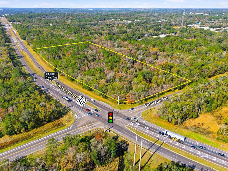 Positioned at the highly visible, signalized corner of Cortez Boulevard (SR-50) and Emerson Road, this 13.74-acre tract offers a prime development opportunity in Hernando County’s growing commercial corridor. The property boasts over 1,200 feet of direct frontage along SR-50, one of the region’s major east–west thoroughfares, ensuring exceptional visibility and strong traffic counts. Its strategic location provides seamless connectivity to US-41, US-98, and the Suncoast Parkway (SR-589), granting convenient access to Tampa Bay and the broader Central Florida market.
