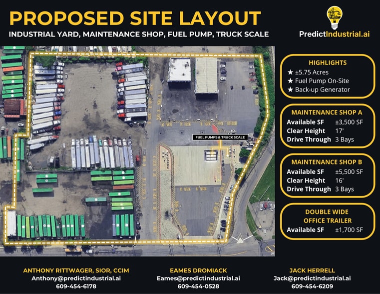 Rare ±5.75-Acre Industrial Yard with maintenance shops, fueling, truck scale, backup generator, and office right of Route 1-9 in Kearny, NJ — positioned in the heart of Northern New Jersey’s port and logistics network. The property includes ±9,000 SF of demisable maintenance/shop space with 16’–17’ clear heights and multiple drive-through bays, plus a ±1,700 SF double-wide office trailer and additional office build-out. A proposed site layout provides efficient truck circulation and operational flow. On-site fuel pump, truck scale, and back-up generator create a fully integrated fleet-ready facility ideal for transportation companies, drayage operators, contractors, and equipment users. Direct access to Route 1&9, NJ Turnpike, I-78, Newark Airport, and Port Newark/Elizabeth.