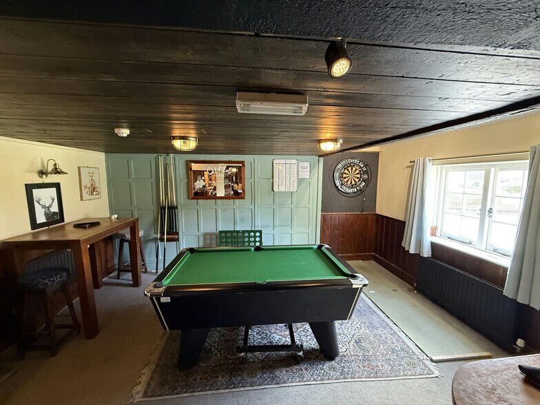 Freehold Public House For Sale The site covers 1.476 acres (0.597 hectares) and has a trapezoid like shape, featuring sloping topography. The property is a detached public house with mixed painted and unpainted brick elevations under a pitched clay tile roof with wooden framed windows. The public house has a retained traditional character with exposed wooden beams, flagstone flooring (in part) and a log wood-burner fire, creating a relaxed atmosphere.