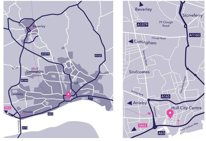 - M62 motorway, one of the main east-west routes in the north of England, connects Hull to Leeds and beyond