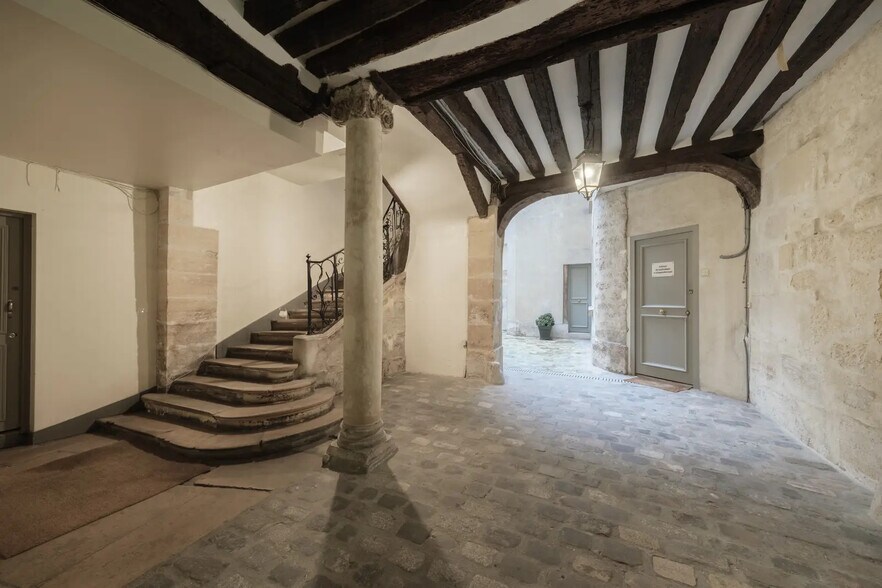 Beautiful old building with a very nice carriage door on the ground floor, featuring a lovely stone staircase and a wooden beam ceiling in the common areas.