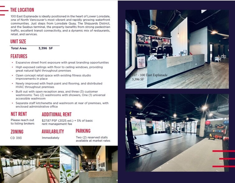 Unit 107 at 100 East Esplanade offers a highly functional and prominently positioned retail space for lease in the heart of North Vancouver’s thriving Lower Lonsdale community. Totaling 3,396 SF, the premises feature expansive street-front exposure, high ceilings, and floor-to-ceiling glazing that brings abundant natural light throughout the interior. The unit is improved with an open-concept retail layout, existing fitness-studio build-outs, fresh finishes, distributed HVAC, and multiple customer washrooms, making it well-suited for a wide range of service-oriented or retail operators. Additional support areas include a staff kitchenette, staff washroom, and an enclosed administrative office, creating a turnkey environment ready for immediate occupancy. Located steps from Lonsdale Quay, The Shipyards District, and the Seabus terminal, the property benefits from exceptional pedestrian activity and seamless access to both local and regional transit options. The surrounding area offers a dynamic mix of restaurants, shops, and community amenities, making Lower Lonsdale one of North Vancouver’s most vibrant and rapidly growing waterfront districts. With strong visibility, reserved parking options, and CD-393 zoning, the property provides flexibility and prominence in a high-demand neighbourhood.