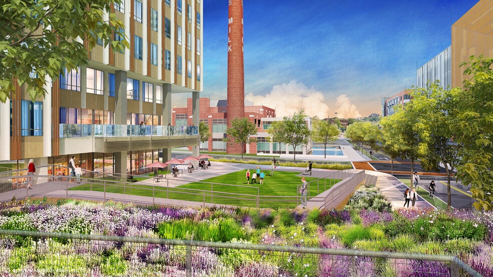 One retail space remaining. Existing retailers include Landry’s Bicylces, Turnstyle Spin, and a Bowling/Entertainment/ Biergarten Concept. +/-50,000 SF of fully leased lab space on the second level. Upper floors are home to +/-900 parking spaces that will serve as the growing campus’ primary parking structure. Situated directly across from the regions only dedicated biking pavilion (operated by Landry’s and includes service center, showers, storage, etc.) AND a public green space hosting community & other events. STREET LEVEL: +/-5,519 SF CEILING HEIGHT: 15’ DELIVERY DATE: Upon Lease Execution