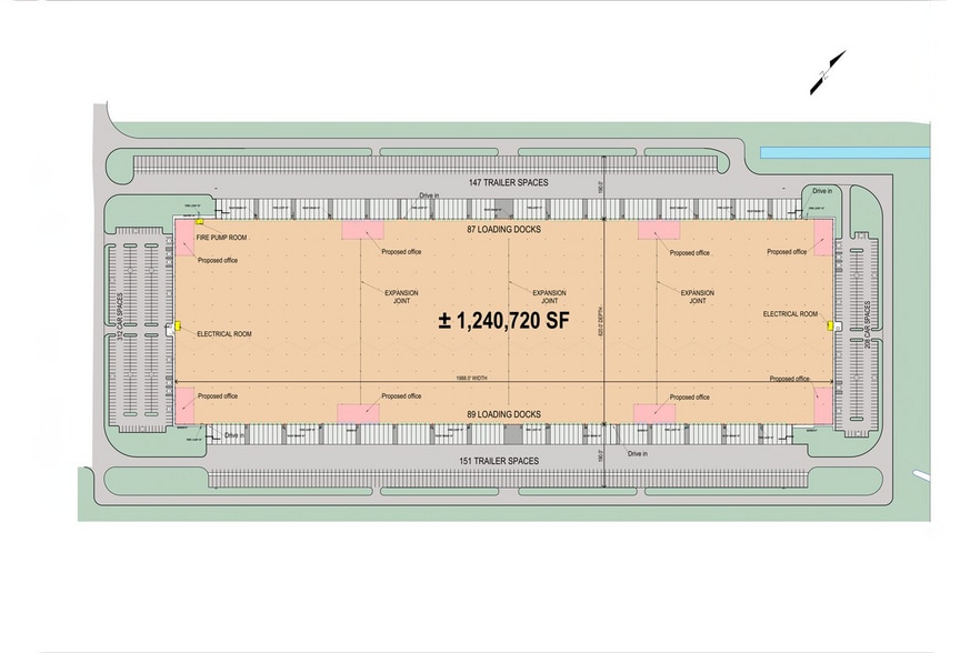 - Site includes 298 trailer and 520 car parking spaces, with a 190-foot truck court depth, designed for efficient logistics operations.