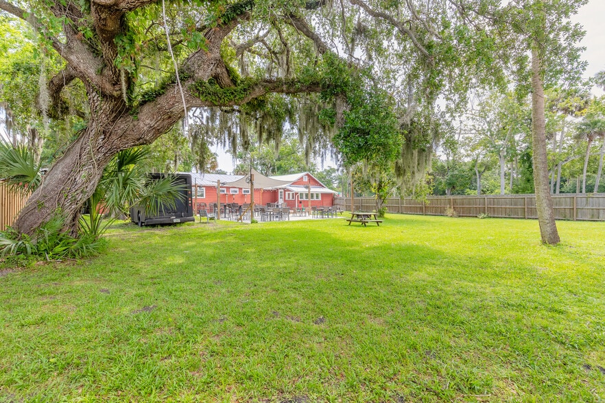 Rare opportunity to acquire a unique, restaurant on highly sought-after Canal Street in New Smyrna Beach, Florida. This charming establishment seamlessly combines modern amenities with timeless appeal, featuring cozy indoor dining and a spacious outdoor patio equipped with abundant seating, shade sails, and ceiling fans to ensure a comfortable atmosphere for guests. Patrons will appreciate two generously sized restrooms designed for convenience. The fully equipped kitchen boasts new, high-quality equipment, including a large hood, ovens, cooktops, prep stations, and all essential components to create exceptional meals efficiently. A detached building provides extra storage space, ideal for additional supplies or equipment. Situated on a large corner lot, the property offers excellent visibility, easy customer access, ample parking, and a fenced yard that enhances privacy and guest experience.