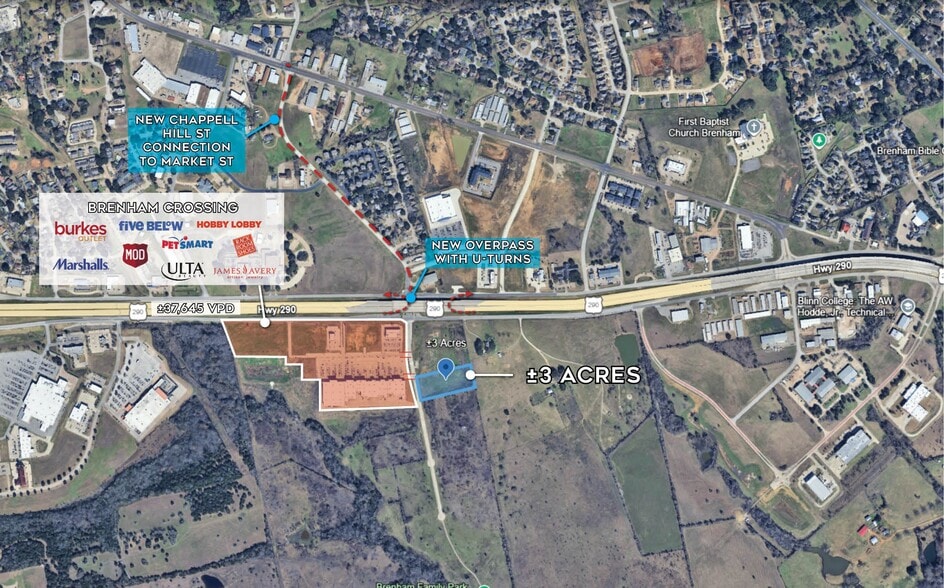 Positioned in a highly desirable location, this ±3-acre tract offers a prime opportunity for development in the growing Brenham market. Situated directly adjacent to the bustling Brenham Crossing Shopping Center, the property benefits from outstanding visibility and convenient access to Highway 290, which sees an impressive traffic count of approximately 37,645 vehicles per day. This site is ideally suited for a wide range of commercial or mixed-use projects. It is located outside of the flood zone, providing added peace of mind for development, and utilities are readily available to streamline the building process. Detention is already in place, further enhancing the property’s readiness for immediate development. Whether you’re looking to expand your portfolio or bring a new project to life, this property presents a rare chance to capitalize on a high-traffic, high-growth area. Positioned in a highly desirable location, this ±3-acre tract offers a prime opportunity for development in the growing Brenham market. Situated directly adjacent to the bustling Brenham Crossing Shopping Center, the property benefits from outstanding visibility and convenient access to Highway 290, which sees an impressive traffic count of approximately 37,645 vehicles per day. This site is ideally suited for a wide range of commercial or mixed-use projects. It is located outside of the flood zone, providing added peace of mind for development, and utilities are readily available to streamline the building process. Detention is already in place, further enhancing the property’s readiness for immediate development. Whether you’re looking to expand your portfolio or bring a new project to life, this property presents a rare chance to capitalize on a high-traffic, high-growth area.