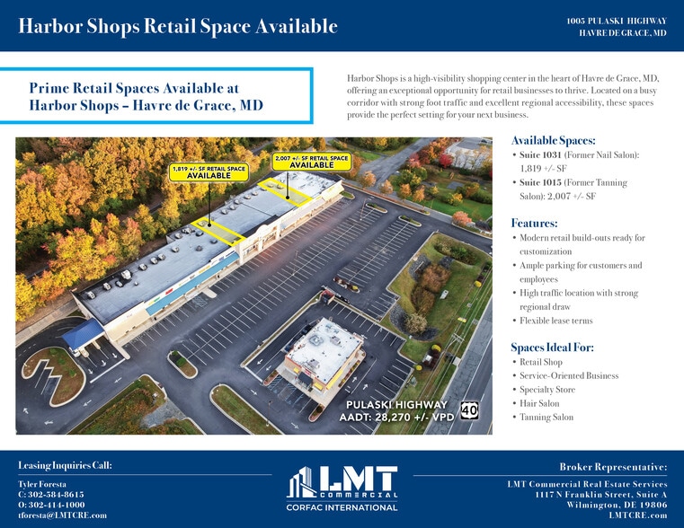 Harbor Shops is a high-visibility shopping center in the heart of Havre de Grace, MD, offering an exceptional opportunity for retail businesses to thrive. Located on a busy corridor with strong foot traffic and excellent regional accessibility, these spaces provide the perfect setting for your next business. Available Spaces: • Suite 1031 (Former Nail Salon): 1,819 +/- SF • Suite 1015 (Former Tanning Salon): 2,007 +/- SF Features: • Modern retail build-outs ready for customization • Ample parking for customers and employees • High traffic location with strong regional draw • Flexible lease terms Spaces Ideal For: • Retail Shop • Service-Oriented Business • Specialty Store • Hair Salon • Medical Use • Medical Fit-Out