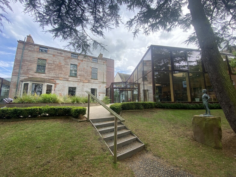 The four storey Category B listed building was comprehensively yet sympathetically redeveloped in 2019 and offers a balanced mix of cellular and open-plan accommodation. Features include level entry & passenger lift, secure 24-hour access, high speed internet, bookable meeting room, and good quality common areas & welfare provision. There is private parking at the front of the building for up to five vehicles. Bike storage is also available. The landscaped rear garden offers tranquil wooded greenspace and an outlook over the River Nith together with outdoor seating, surfaced paths, and adventure facilities. The café is accessed directly from the public footpath, however, there are also internal links to the business centre via the passenger lift, stairwell, and meeting room.