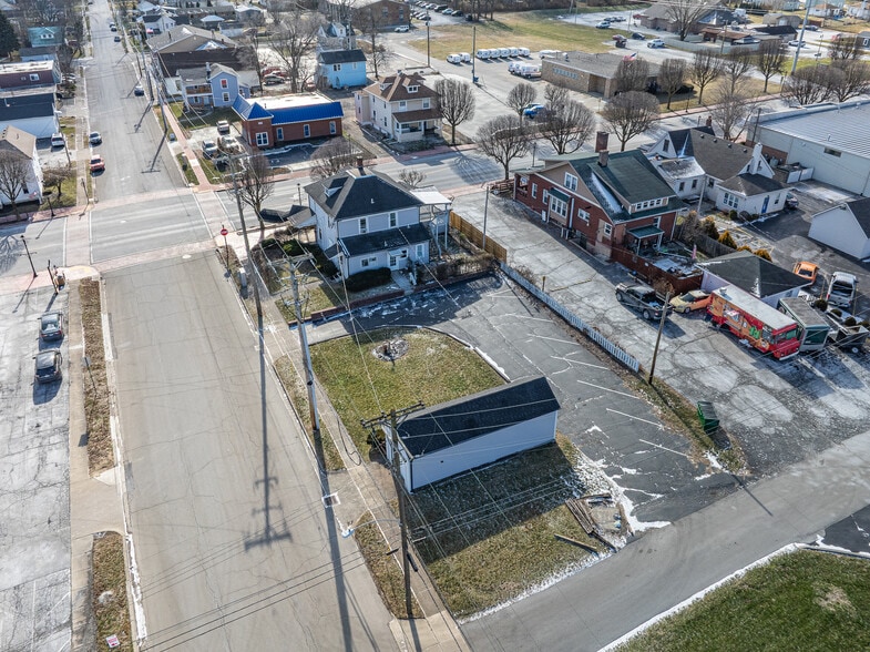 The second floor features a two-bedroom apartment with a full bathroom, providing an ideal owner-occupant or live/work opportunity. Additional features include two half bathrooms on the main level, a detached garage, and eight off-street parking spaces. Suitable for a variety of professional or service uses including office, retail, studio, or similar permitted C-3 uses.