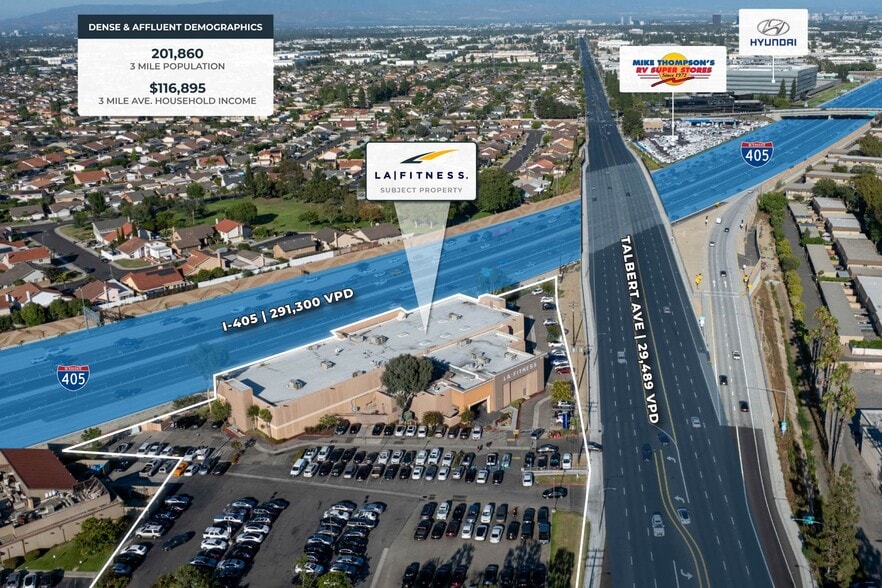 Situated near the intersection of Interstate 405 and Talbert Ave, the property boasts visibility to daily traffic counts of 320,789 vehicles. It is conveniently located adjacent to the Orange Coast Medical Center and less than a mile from the bustling Fountain Valley Promenade, surrounded by a variety of national and local retailers. The area is marked by dense and affluent demographics, with over 201,800 residents within a 3-mile radius, each household averaging an income of over $116,000, making this an exceptional investment opportunity in a generational location.