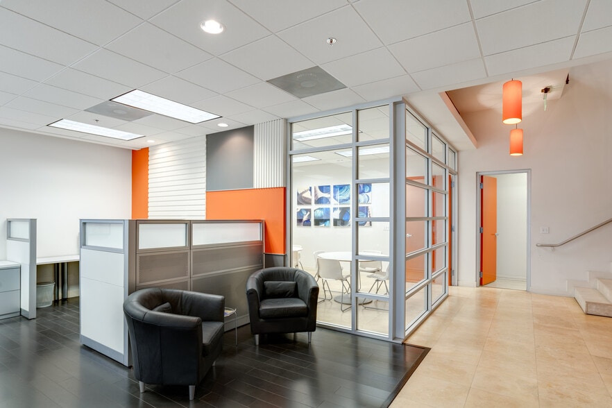 Combining two suites into one seamless space, the property offers a sophisticated and functional design that will impress clients and create a productive work environment. The office features multiple private offices, open workstations, and a conference room, all designed with modern finishes, including glass-walled offices and dark hardwood floors. Natural light fills the space through large windows, creating a bright and inviting atmosphere.