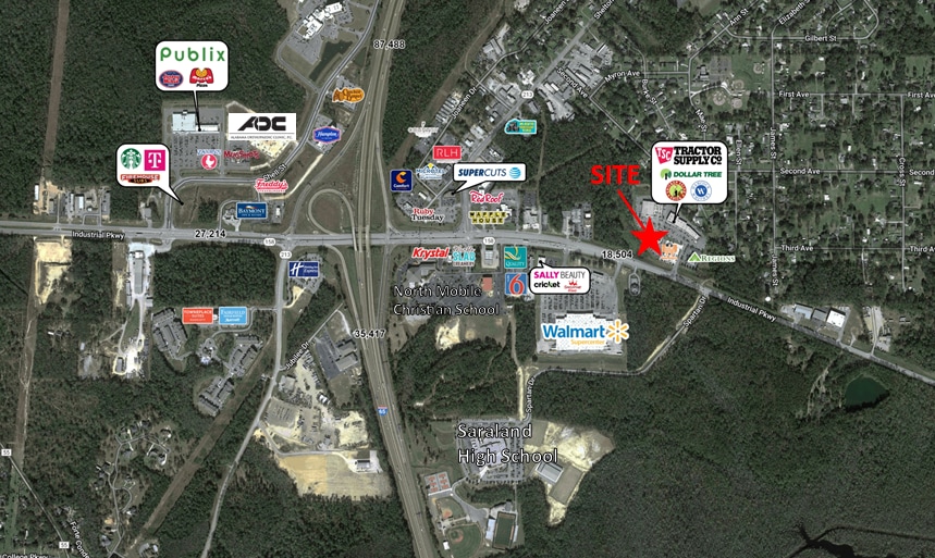 Herrington Realty is pleased to present an exclusive opportunity to purchase a stabilized, three-tenant strip center in the fast-growing city of Saraland, Alabama. Anchored by McAlister’s Deli, which occupies 3,200 SF and features a drive-thru, the property is perfectly positioned directly on the city's main retail corridor. It sits prominently across from Saraland High School and a Walmart Supercenter, ensuring high visibility and consistent traffic. 1st Franklin Financial and TherapySouth round out the remaining units, providing a diverse and reliable tenant mix.