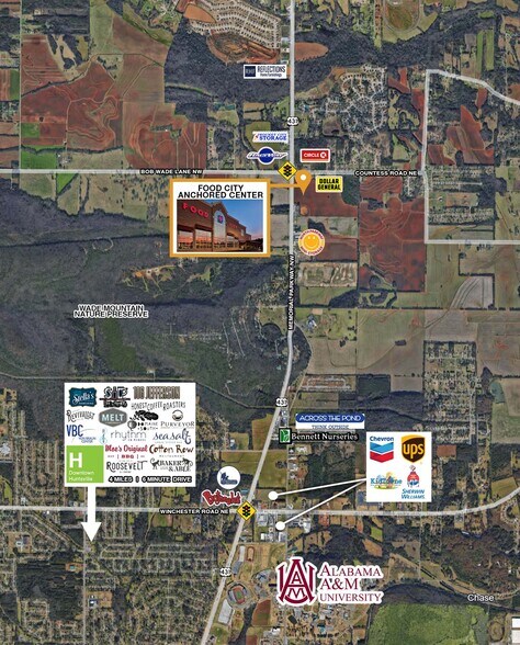 ABOUT THE PROPERTY Situated on NW Memorial Parkway and Bob Wade Lane in the future Food City-anchored center. With great visibility, access to a signalized intersection, and shared traffic with a national tenant, this location is perfect for businesses looking to serve an area with growing population.