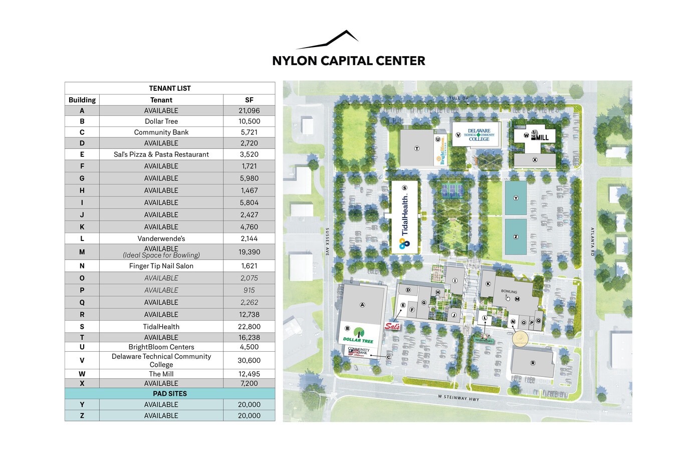 Soon to be a premier destination in Sussex County, Delaware, the 218,000+ square foot Nylon Capital redevelopment is located in the heart of Seaford, fronting Stein Highway. This innovative community center will feature a dynamic mix of institutional and recreational spaces, combining adaptive reuse with new construction to create a vibrant environment for a diverse range of tenants. This development will redefine how residents and travelers experience western Sussex County, offering opportunities to work, learn, shop, dine, and engage in recreational sports without leaving its expansive 23-acre campus. Confirmed anchor tenants include notable educational institutions such as Delaware Technical Community College, BrightBloom Centers, and The Mill, a professional coworking venue offering both shared and private office and meeting spaces. Additionally, a new 22,000-square-foot, state-of-the-art healthcare facility for TidalHealth will be centrally located, overlooking the shared campus green and pickleball courts. The complex will also feature a Rite Aid Pharmacy, Vanderwende's Creamery and the much-anticipated reopening of the town’s beloved bowling alley!