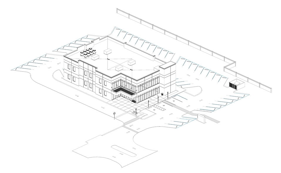 This modern two-story medical office building blends timeless architecture with a design inspired by the surrounding environment and a focus on wellness. A prominent two-story entrance creates an open and welcoming arrival experience, featuring a light-filled atrium that enhances natural daylight and reinforces the building’s health-focused design. The building is carefully oriented on the site to maximize natural light and outdoor views while maintaining patient privacy. Circulation throughout the property is intuitive and efficient, providing clear access for patients, staff, and visitors. The main entrance is designed as a visible and inviting drop-off point along the arterial roadway, serving as a clear wayfinding landmark. The site plan thoughtfully preserves existing mature trees and integrates pedestrian walkways, landscaped areas, and convenient parking to create a comfortable and accessible medical campus environment.