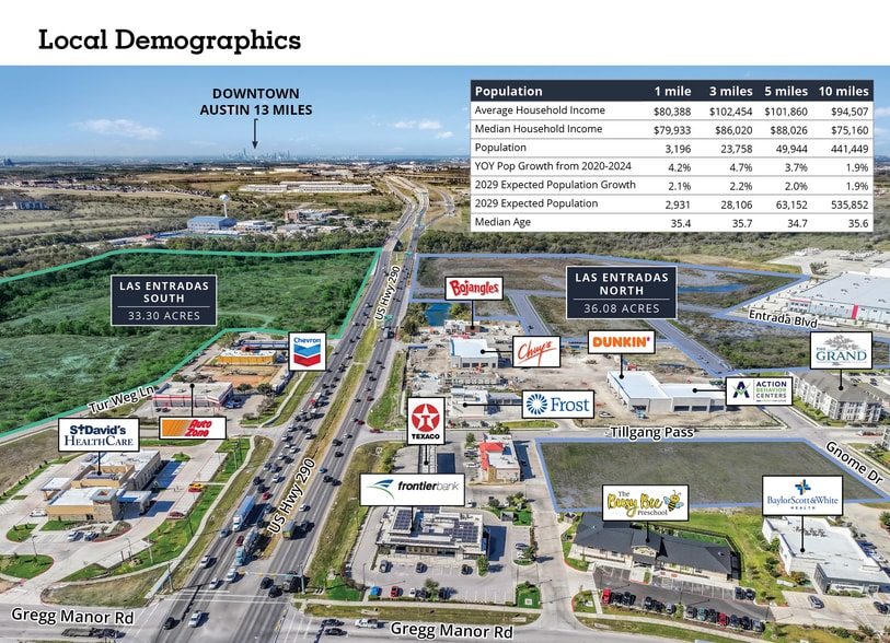 Las Entradas North (36.08 acres) and Las Entradas South (33.30 acres) comprise a 69.38-acre premier mixed-use development opportunity in the heart of booming Manor, TX, just minutes from East Austin along U.S. Highway 290. With ±892 feet of direct highway frontage, multiple ingress/egress points, and full-movement access along a corridor carrying over 64,000 vehicles per day, the Properties offer exceptional visibility and accessibility. Zoned C-1 (Light Commercial), the site allows for a wide range of uses including retail, restaurant, medical, hotel/convention center, office, flex, and mixed-use development. Preliminary plans support ±152,000 SF of building area and ±685 parking spaces, with infrastructure currently underway and pad-ready sites available. Situated adjacent to national retailers such as Walmart, H-E-B, Chick-fil-A, and Chipotle, and surrounded by thousands of new residential units delivered or under construction, the Properties benefit from strong demographics (average household incomes exceeding $100,000 within a 3–5 mile radius) and explosive population growth that continues to outpace retail supply. Positioned within one of the fastest-growing submarkets in the Austin MSA, Las Entradas offers a rare, large-scale development opportunity in a high-demand growth corridor.