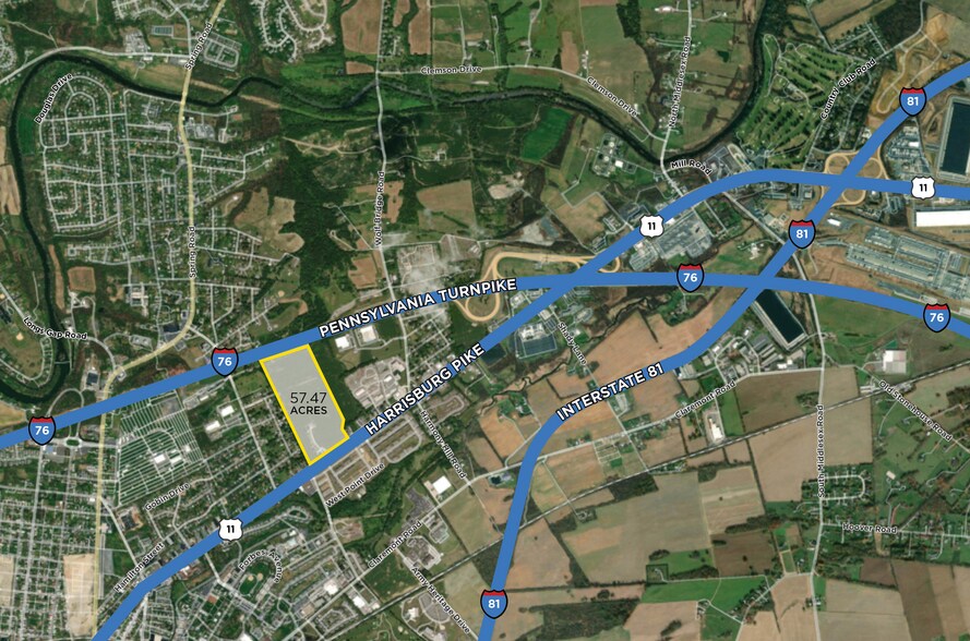 The property is mostly flat, zoned Commercial Light Industrial, and the frontage along Harrisburg Pike is zoned Neighborhood Commercial. Potential visibility from the PA Turnpike.