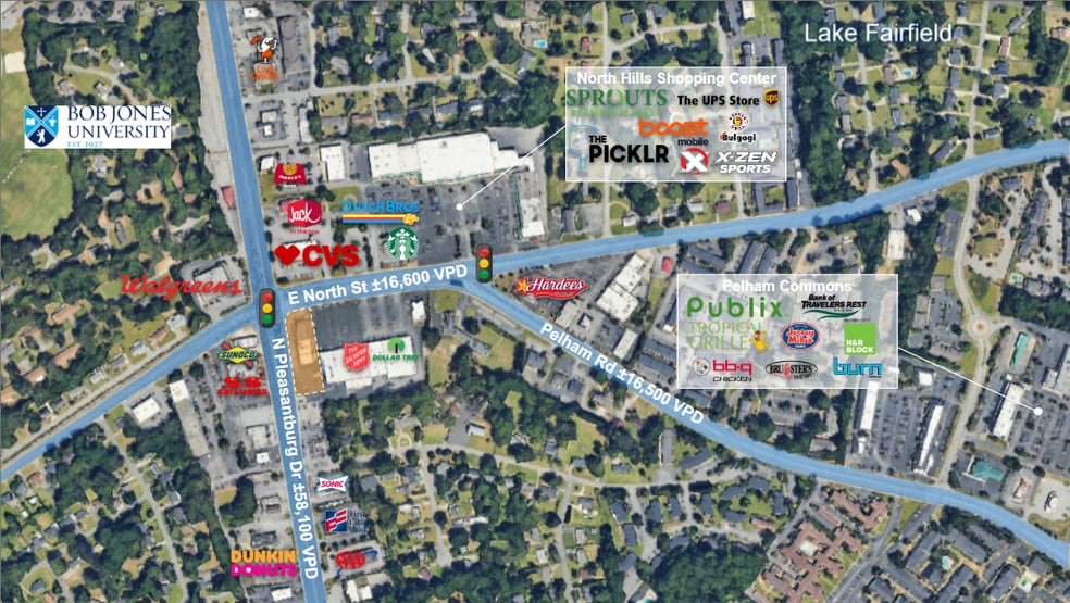 Reedy River Retail at SVN | Palmetto is pleased to present ±1,018 SF of retail/office space available at 1046 N Pleasantburg Drive in Greenville, SC. Located at the signalized intersection of N Pleasantburg Drive and E North Street, the property offers exceptional visibility and access along one of Greenville’s busiest intersections. The available suite is a former Allstate office with patio potential in the rear, making it well suited for retail, medical, or office users seeking a highly visible location. The site benefits from strong surrounding retail including Sprouts, CVS, Walgreens, Starbucks, and Dutch Bros, along with outstanding traffic exposure of ±58,100 VPD on N Pleasantburg Drive and ±16,600 VPD on E North Street.