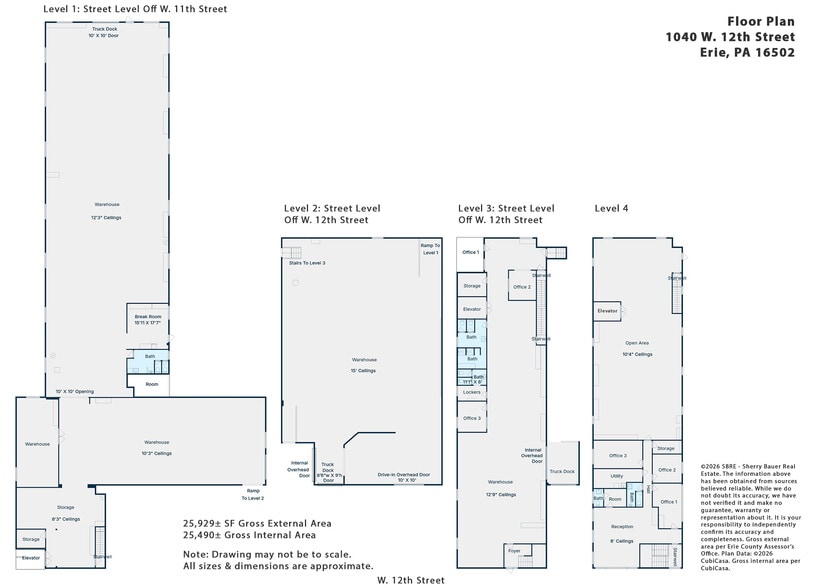 25,929± SF industrial facility along one of Erie’s major east-west corridors near downtown. Just 1 mile to I-79 & 7 miles to I-90. Facility features 2 truck docks, 1 drive-in overhead door, 10’-15’ ceilings, 600 Amp, 220/440V, 3 phase service & multiple restrooms. 4,847± SF upper level office space. 21,082± SF warehouse/industrial space. 81% industrial space & 19% office. Existing wet sprinkler system and freight elevator to levels 1, 3 & 4. Interactive floor plan available. Situated on 2 parcels totaling 0.59± acres with frontage along W. 12 Streets & W. 11th Street. Excellent visibility with 20,000 average daily traffic (PennDOT AADT 2024 count year). Less than ½ mile from recent new developments including the Cathedral Preparatory Event Center and Ironworks Square, a $25 million dollar mixed-use redevelopment project. Zoned Heavy Manufacturing (M-2) & Medium Density Residential (R-2). Zoning permits many uses: auto repair & sales, light & heavy manufacturing, warehousing, vehicle storage, office, commercial recreation, pet grooming, animal care, personal self-storage & more. Contact broker to learn more or to schedule a tour.