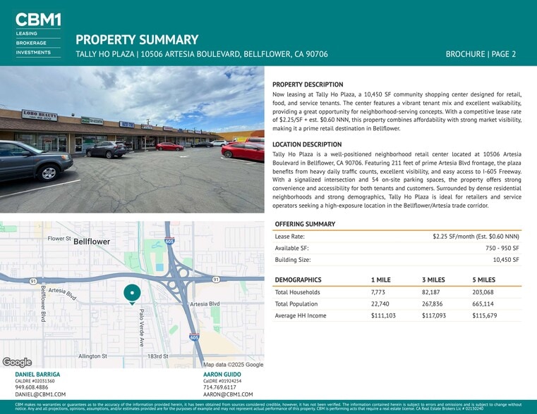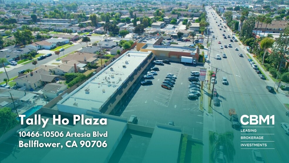 Now leasing at Tally Ho Plaza, a 10,450 SF community shopping center designed for retail, food, and service tenants. The center features a vibrant tenant mix and excellent walkability, providing a great opportunity for neighborhood-serving concepts. With a competitive lease rate of $2.25/SF + est. $0.60 NNN, this property combines affordability with strong market visibility, making it a prime retail destination in Bellflower. Tally Ho Plaza is a well-positioned neighborhood retail center located at 10506 Artesia Boulevard in Bellflower, CA 90706. Featuring 211 feet of prime Artesia Blvd frontage, the plaza benefits from heavy daily traffic counts, excellent visibility, and easy access to I-605 Freeway. With a signalized intersection and 54 on-site parking spaces, the property offers strong convenience and accessibility for both tenants and customers. Surrounded by dense residential neighborhoods and strong demographics, Tally Ho Plaza is ideal for retailers and service operators seeking a high-exposure location in the Bellflower/Artesia trade corridor.