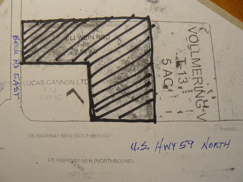SELLER FINANCING 7.01Acre Commercial Site near Victoria airport. Great location to promote your business. 375 ft of Highway 59 (future I-69) frontage, billboard space and 30,000 vehicles daily, 1,000,000+ month allows a unique advertising opportunity. An "L" shaped lot allows access on Beck Road East at 105 Beck RD E. 77968; as well as highway 59 at: 12918 Highway 59 North 77968.