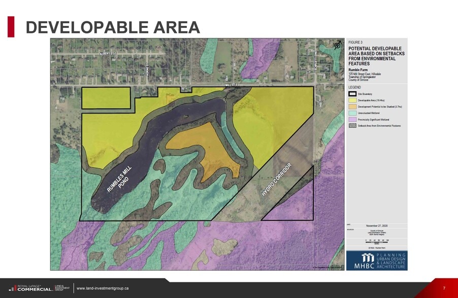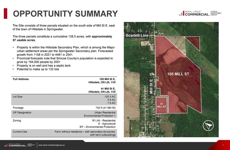 This site consists of three parcels situated on the south side of Mill St E, east of the town of Hillsdale in Springwater. The three parcels constitute a cumulative 138.5 acres, with approximately 57 usable acres. This property is within the Hillsdale Secondary Plan, which is among the Major Urban Settlement Areas per the Springwater Secondary plan. These areas are where the city anticipates the majority of new developments will occur in the next 20+ years. The population in Hillsdale is projected to grow from 1158 in 2021 to 4481 by 2041. Provincial forecasts note that Simcoe County’s population is expected to grow by 194,000 people by 2051.