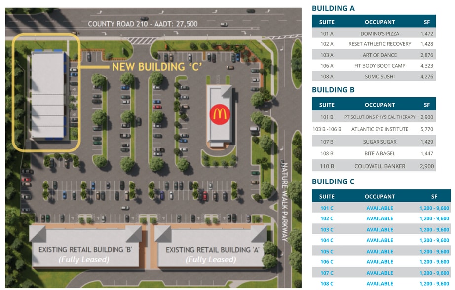 » 1,200 - 9,600 SF Office/Retail Space for Lease » Building C Coming Soon — Summer 2026 » Positioned 5 miles north of Baptist Health’s 33.75 Acre medical campus development » Located in the growing and affluent CR 210 trade area in northwest St. Johns County » Average household incomes exceeding $110,000 within a 5-mile radius » Easily accessible from both CR 210 & Nature Walk Parkway, which offers direct access from the 583-home golf community, Johns Creek