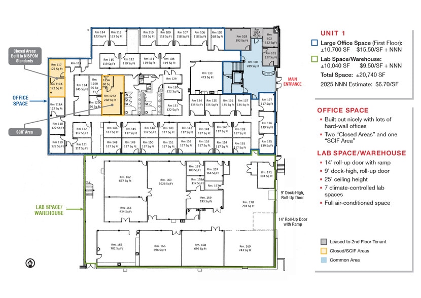 Office Space: ±10,700 SF $15.50/SF + NNN Lab Space/Warehouse: ±10,040 SF $9.50/SF + NNN Total Space: ±20,740 SF 2025 NNN Estimate: $6.70/SF HIGHLIGHTS - Central metro area location with easy access to I-40 - Easy access to Sandia National Labs/Kirtland AFB Eubank gate - Numerous amenities nearby - 7 climate-controlled lab spaces - Two “Closed Areas” and one “SCIF Area” - Fiber optics - 14’ roll-up door with ramp - 9’ dock-high, roll-up door - 25’ ceiling height - Strong parking ratio: 6:1,000