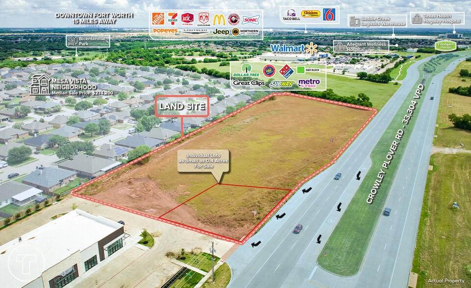 Trinity Real Estate Investment Services is pleased to present the opportunity to acquire 4.96 AC Pad Sites in Crowley, TX. This property is within the Dallas–Fort Worth MSA and is zoned for commercial use. It offers exceptional visibility and access along FM 1187, a highly trafficked corridor with 33,000+ vehicles per day—ideal for retail, office, or service-based tenants seeking strong exposure and accessibility.