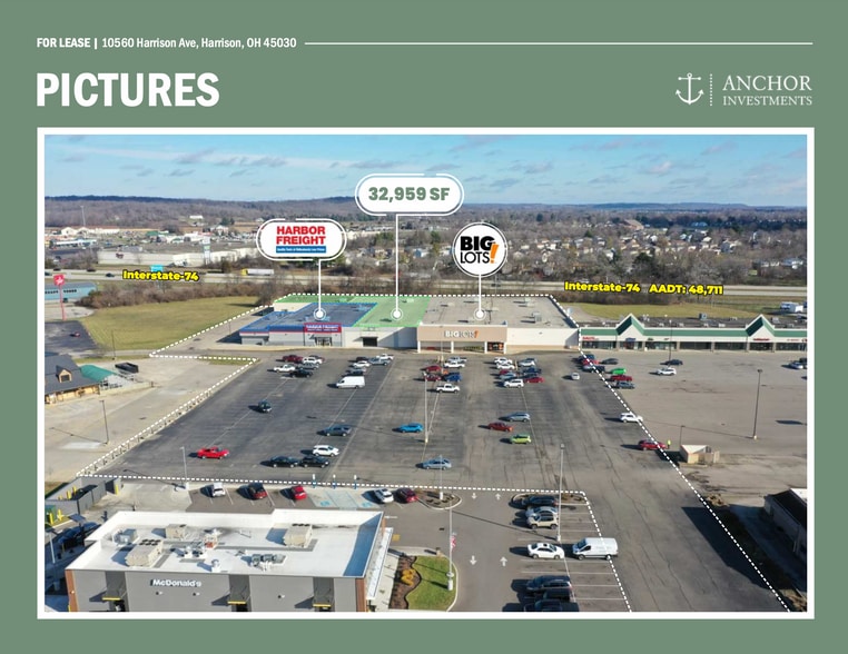 Property Overview: Anchor Space: 40,000 square feet available for lease. Additional Vacancy: A separate 32,959-square-foot big box retail space available for lease. Key Features: Prime Location: Situated in Harrison, OH, within a well-trafficked retail corridor. Current Tenants: The shopping center includes Harbor Freight, providing a steady stream of foot traffic and complementary retail synergy. Trade Area Strength: Surrounded by a robust customer base and supported by high vehicle and pedestrian traffic counts.