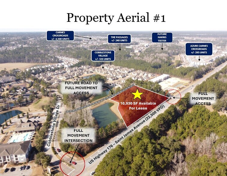 The Subject Property is +/- 2.60 Acres of land with significant frontage on US Highway 176. The Parcel will be developed into a two-building commercial project. The rear building will feature a day care facility. The front building is ideal for retail, service, and restaurant Tenants who are looking for a location with great opportunities for signage and visibility. The property will be served by a direct full movement access point on Highway 176 (which is shared with the adjoining Carnes Station retail development). The site will also be served by a future road at the rear of the property which will provide access to the existing full movement intersection at Cobblestone Village Drive. The new development will feature a +/-12,000 SF daycare facility in the rear and two +/- 5,465 SF multi-tenant retail buildings in the front for a total +/- 10,930 SF. The retail buildings will each have a courtyard endcap. The development will be served by a common parking lot of 108 spaces.